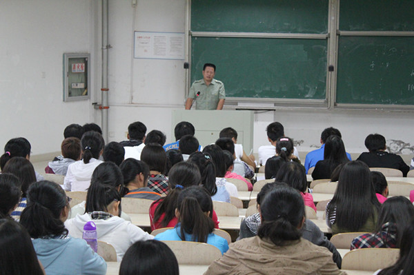 刘训强首先向新生们介绍了校保卫处的工作职责,他指出:安全问题是关乎每位同学正常大学生活的关键,学生家长在同学们进入校园的那一刻,无时无刻不紧绷了一根弦,那就是安全。他从防盗、防骗、防火、防传销以及交通安全等多个方面,着重从人身安全和财产安全出发,结合自身曾经从事多年辅导员工作的经验,分析大学生出现安全问题的深层次原因,并举以实例,用身边的案例增强学生对安全的认知和重视,提出安全预防措施及应急处理方法,告诫学生要引以为戒,增强安全意识,提高自我保护和安全防范能力。