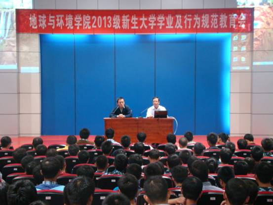 9月26日晚,地球与环境学院在北区图书馆报告厅举行2013级新生大学学业及行为规范教育会。校教务处教学运行科科长刘云瑞老师为新生作了“我的大学学业”专题讲座,2013级全体名新生聆听了讲座。新生辅导员邵飞老师主持了教育会。