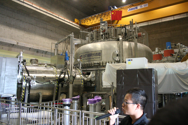 氘是核聚变的理想燃料,由于海水中上亿年的储蓄量,所以氘被视为人类的终极能源,如何有效地控制氘聚变是当前核能科学的难题。座落在中国科学院等离子体研究所的大科学装置—托卡马克(俗称“人造小太阳”),是极有可能实现有效控制氘聚变的装置。师生一行兴致勃勃地参观了该装置,并在技术人员的现场讲解中对装置原理、装置设计有了直接认识。