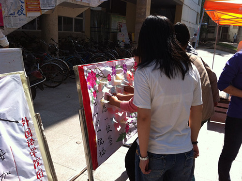 10月12日,在农历九月初九重阳节即将来临之际,外国语学院在西区食堂门口举办“一心一祝福,一愿一便签”活动,学生自发搭起签名墙,写下对父母等亲人的感恩和祝福,抒发思乡之情。