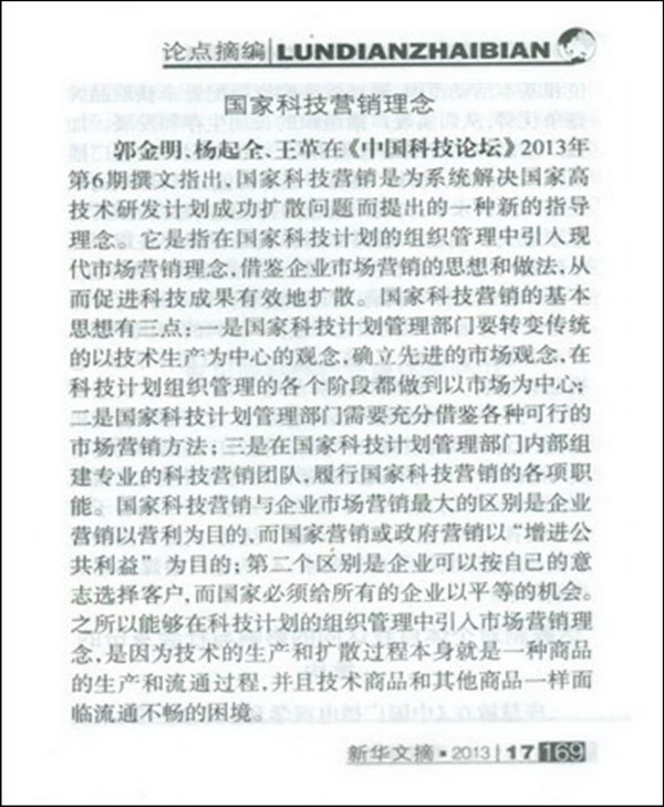 国家高技术研发成果的扩散问题是我国科技计划组织管理中存在的难题,我国科技界一直在探索有效解决这个问题的方法。郭金明老师和自己的博士导师杨起全研究员以及中国科学技术发展战略研究院的另一位合作者王革研究员在过去的三年中对科技成果的扩散问题进行了系统研究。在系统研究的基础上三位作者尝试将市场营销的思想引入科技计划管理之中,提出采用现代市场营销理念来解决科技成果扩散问题的办法。国家科技营销在国内是一种全新的理念,因此受到《新华文摘》的关注。
