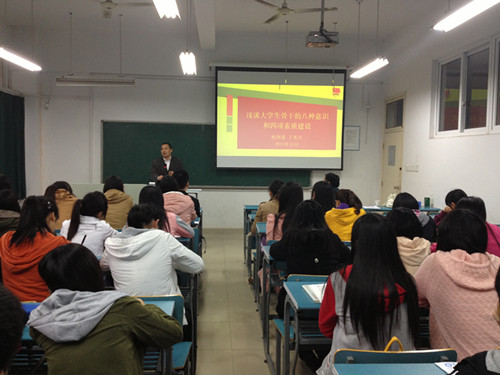 王先江从大学生骨干应具备的的八种意识即政治意识、责任意识、大局意识、服务意识、榜样意识、团结意识、创新意识及服从意识入手,重点介绍了政治意识对于学生成长成才的重要意义,他指出政治意识即要把个人命运和国家命运牢牢结合在一起,做到立场坚定、旗帜鲜明,要有崇高的历史使命感和社会责任感,有强烈的民族自尊心和民族精神,做到眼中有国,心中有家,在遇事时要有担当,沉着冷静,用合法的途径解决问题。对待工作时要一丝不苟,做到言行一致表里如一,并适时发挥创新精神。
