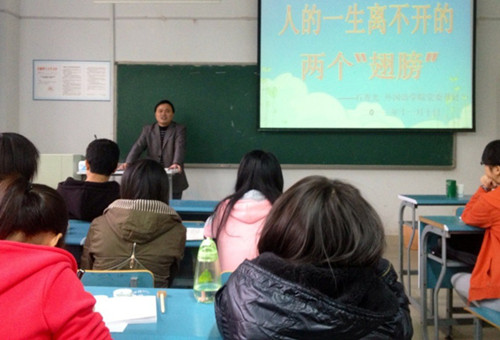 11月10日,医教204,外国语学院党委书记石秀光、副书记程秀霞分别为“青马工程”培训班学员作题为《人的一生离不开的两个翅膀》和《我的心中每天开出一朵花》的报告。