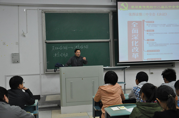 董淑平分析了在我国改革开放事业进入关键时刻召开的十八届三中全会的重大意义,带领同学们重点解读了十八届三中全会通过的《中共中央关于全面深化改革若干重大问题的决定》的主要精神。他用图表的形式向大家展示了十八届三中全会《决定》确定的全面深化改革的指导思想、总目标、重点、2020年改革愿景,逐项分析了15项改革部署;在此基础上,他重点对“使市场在资源配置中起决定作用”等8个要点和19项具体措施进行解读。