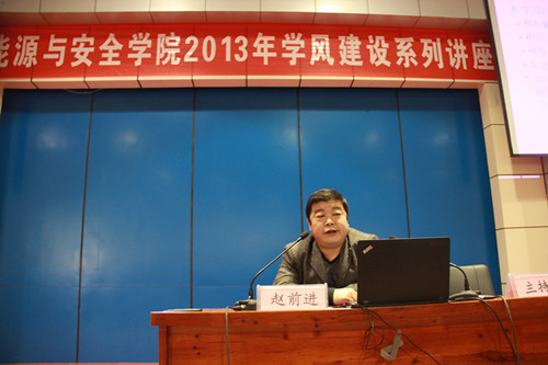 11月16日下午,能源与安全学院邀请教务处副处长赵前进教授,在北区图书馆报告厅为2013级学生举行如何学好高等数学的学风建设专题讲座。讲座由学院党委副书记金德主持。