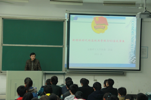为贯彻落实团省委《关于做好全省高校2013级新生班级团支部微博建设的通知》精神,运用新媒体推进高校团学工作,满足90后大学生多样化需求,11月17日下午,能源与安全学院团委在北实403教室开展新媒体时代下高校共青团工作建设探讨活动。校团委副书记彭晶老师应邀为学院大学生骨干作《新媒体时代下高校共青团工作与90后大学生》知识讲座。