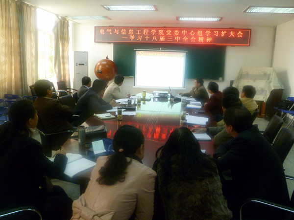11月21日上午,电气与信息工程学院在3楼会议室召开党委中心组学习扩大会,集中学习党的十八届三中全会精神。会议由学院院长黄友锐主持,学院党委中心组成员、各系、实验中心主任、各教工党支部书记20余人参加学习会。
