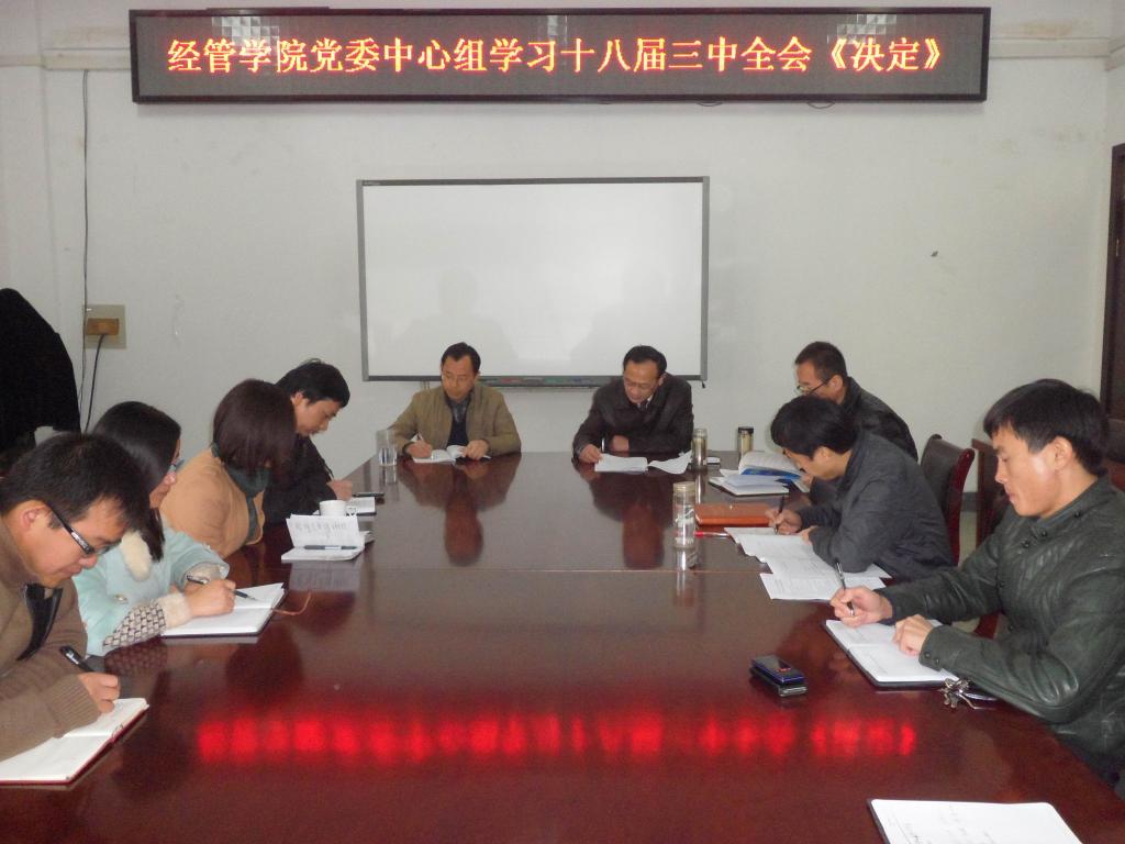 11月25日上午,经济与管理学院在学院会议室召开党委中心组学习扩大会,集中学习党的十八届三中全会通过的《中共中央关于全面深化改革若干重大问题的决定》。会议由学院党委书记崔跃武主持,学院党委中心组成员、科级干部、辅导员和办公室人员参加了学习会。