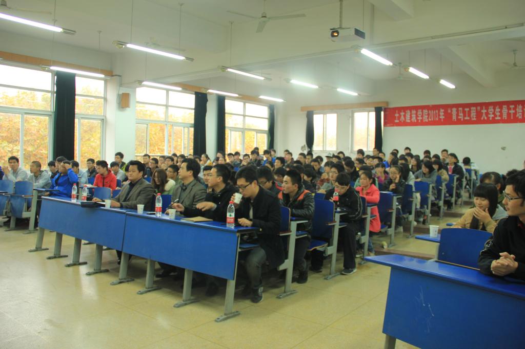 11月23日上午,土木建筑学院2013年“青马工程”暨大学生骨干培训班开班仪式在北校区2401教室隆重举行。学院2013级班级干部代表、新生党员、院学生会2013级新干事150人齐聚一堂,开始了为期两天的集中理论学习。学院党委书记盛真、党委副书记丁志强、团委书记陈峰、2013级新生辅导员张国胤、马帅出席了开班仪式。
