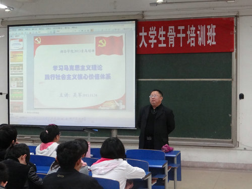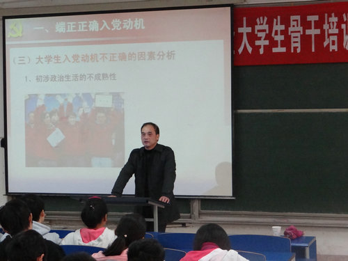 当天下午,测绘学院党委书记陈艺和学院党委副书记兼行政副院长吴军分别进行授课,陈艺以“端正入党动机,争取早日入党”为中心,教育同学们“正确的入党动机对中国共产党的未来非常重要”,“组织上入党一生一次,思想上入党一生一世”。吴军做了题为《学习马克思主义理论,践行社会主义核心价值体系》的授课,从马克思主义理论入手,教导大学生以社会主义核心价值体系为主导,注重自身素质的培养,提高思想认识和道德素质,为社会主义的发展艰苦奋斗,贡献力量。