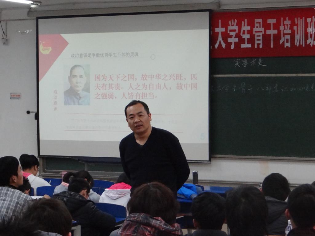 开班仪式结束后,校团委书记王先江老师进行第一讲授课,题目为《浅谈大学生骨干的八种意识和四项素质建设》,为同学们展开了一场加强思想政治教育, “八种意识”即政治意识、责任意识、大局意识、服务意识、榜样意识、团结意识、创新意识、服从意识。“四项素质”为正确的政治素质、过硬业务素质、良好道德素质、健康心理素质。王先江老师以亲身的经历和切身的体会陈述了当今时代对大学生的要求,同学们互动热烈,效果良好。