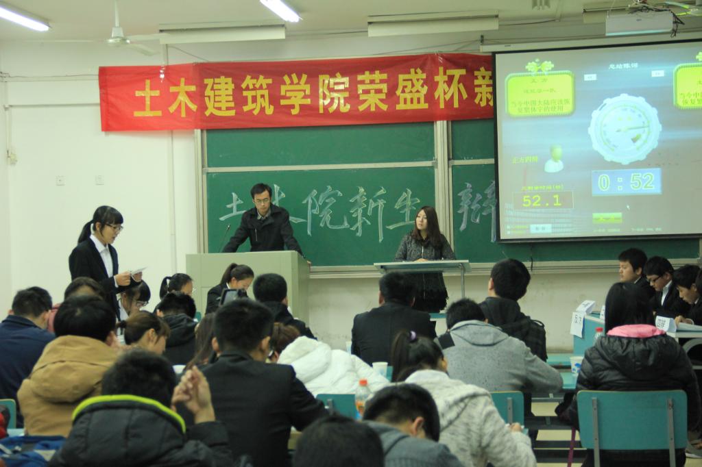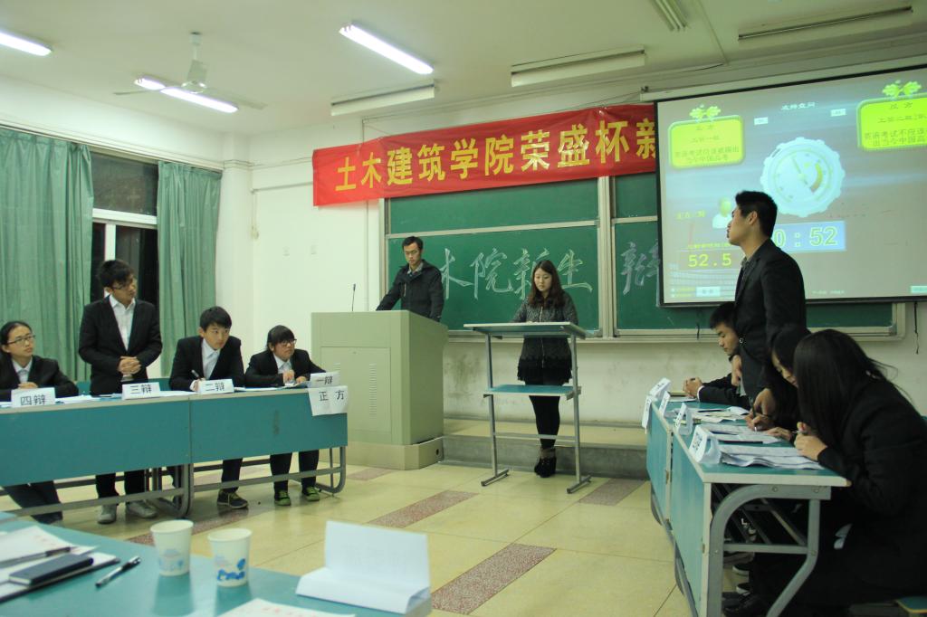 土木建筑学院“荣盛地产杯”第六届新生辩论赛历时近1个月,学院2013级20个班级代表队参加了本次辩论赛。辩论赛决赛于11月24日晚在北校区北实202教室举行,学院党委副书记丁志强、团委书记陈峰和各年级辅导员出席比赛并担任评委。