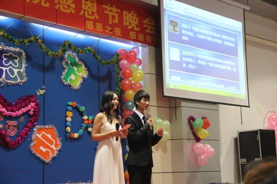整场晚会主题突出,现场气氛十分活跃。晚会共分为3个篇章:感恩父母——亲情浓、感恩学校——谢师恩、感恩社会——愿国宏。晚会在大屏幕播放的《感恩节征言》中拉开帷幕。一首《突然好想你》把远离家乡的同学带进了淡淡相思之中,想起了父母、亲人在自己成长中的呵护和陪伴;小品《爸爸,我们有钱吗?》,不仅给观众们带来欢笑,更加引人深省,让大家了解到这世上还有许多用金钱买不到的宝贵财富;兄弟学院同学带来的《杯子舞》,给大家耳目一新的感受;充满青春活力的舞蹈《舞动青春》,让大家看到的是少年勃发的生命力,掀起了晚会的高潮;奇幻的魔术表演《魔环世界》带来的是神奇与令人惊异奇妙的感触,让观众们感叹魔术师的魅力;话剧《钓鱼岛》用夸张的表演,极大地讽刺了日本强占钓鱼岛可笑闹剧,展现了中国人民捍卫国家主权的决心;一曲耳熟能详的《龙的传人》激起了我们华夏儿女的民族自豪感;张文涛老师带来一曲深情款款、激昂澎湃的《中国人》更是让我们感到作为一个中国人是一件多么令人骄傲与自豪的事!晚会最后,由爱心社带来的手语表演《感恩的心》……在整场晚会中还有古筝等乐器表演,更有微博互动和知识问答等趣味活动,为本次晚会增添了色彩。