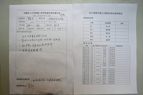 为了更好地管理和服务学生,学院规定辅导员、班主任每周至少听课一次,每次至少一节,主要听本人所带班级的课程。辅导员深入班级,与任课老师交流班级的到课率、听课情况等,认真听取任课老师的意见和建议,并及时反馈到班级,查漏补缺,对存在的问题及时采取有效措施。