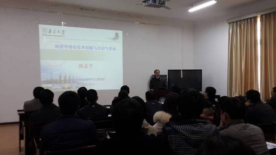 姚素平教授首先表达了对母校培养的感激之情,欢迎我校学生多去南京大学求学深造。随后,姚素平分“非常规油气地质特征、美国页岩气革命的发展历程、科技进步在页岩气革命中的作用、中国页岩气资源发展前景和中国页岩气勘探开发面临挑战与对策”五大方面内容,系统地阐述了非常规油气勘探开发过程及其特点,重点结合地质认识、水平钻井、水力压裂、储层描述等创新技术讨论了页岩气勘探开发近200年来的成果,通过北美及我国页岩气资源对比、勘探开发历程比较,以丰富详实的数据和事例向我们展示了我国页岩气开发利用的巨大前景,同时客观地分析了未来页岩气勘探开采过程中所面临的挑战并讨论了解决策略。