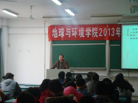 12月7日下午,在北区实验楼202教室校学生处处长田中良应邀为地球与环境学院2013级学生干部作了一场题为“用忠诚告慰青春,用奉献历练成长”的报告会。学院党委副书记侯辉主持报告会,2013级学生辅导员以及100余名学生干部聆听了报告会。