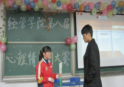 同学们在这个阶段心理产生了微妙的变化,有的同学开始对大学的学习失去了兴趣;有的同学开始找理由逃课;有的同学不会和其他同学交往,开始封闭自己。在这个阶段,学院发现了学生的心理变化,以“12.5——要爱我”为主题开展了系列活动,让新生给自己心理一片晴空,走出心灵孤岛;放飞梦想,规划人生;用心交往,构建和谐。我们要让新生在寻找和感受中发现自我,关心自我,相信自我,发展自我。