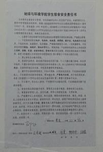 为进一步强化学生的安全意识,明确各级安全员的工作责任。近期,学院与班级签订《地球与环境学院班级安全员安全责任书》,与宿舍签订《地球与环境学院学生宿舍安全责任书》,结合卫生评比与学风教育,统一学生寝室管理。主要从禁止大功率及违章电器的使用、随意使用明火、私拉乱接电源三个方面着手,辅以寝室学风和道德水平进行评比。并在辅导员老师的监督下,组织学生会干部加强安全隐患的排查工作,做到每日一查寝,每周一汇报,每月一评比,将学生宿舍消防安全工作落到实处。