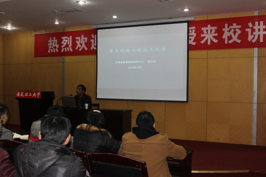 12月14日下午,应科技产业处和测绘学院的邀请,安徽省测绘局基础测绘信息中心总工杨友长教授在图书馆西会议室为我校师生作了题为“重点测绘工程技术发展”的学术报告。报告会由测绘学院副院长徐良骥主持。测绘工程2012级本科生全体及部分研究生教师共100多人聆听了本次讲座。