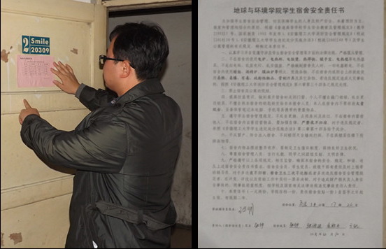 为了更好地推进学院安全教育工作,12月以来,学院在学校各个校区的学生公寓中张贴学生信息卡和学生安全责任书。信息卡中,详细列出了宿舍成员的职务、政治面貌等内容,通过公开亮明学生干部和党员的身份,进一步规范学生干部和学生党员的行为规范,从而做到“一个人带动一群人,一个宿舍带动一个班级”,由点及面地开展安全教育工作。通过张贴安全责任书,明确安全责任,努力确保学生公寓安全管理无死角,切实提高大学生安全防患意识。
