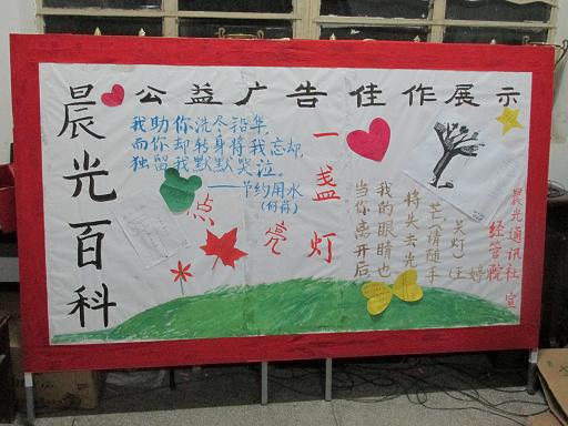 12月16日,经济与管理学院晨光通讯社和学生会分别举行了公益广告语征集活动和公益广告设计大赛。此次活动是围绕与公益有关的题材如道德、环保、资源节约、健康、卫生、权益保护等主题进行的广告征集。为了使更多的同学参与进来,本次活动首次采取了进班级和宿舍宣传的方式。
