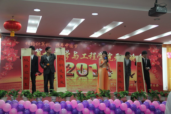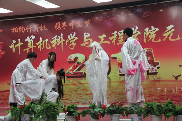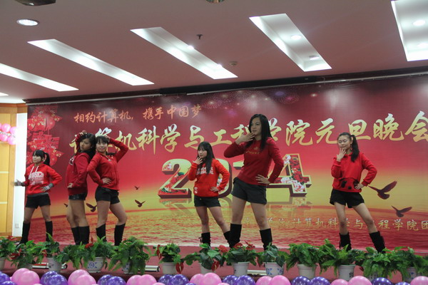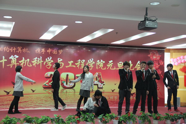 户外寒风咧,室内春意浓。12月29日,计算机科学与工程学院在岁末年初之际在校本部9楼报告厅举办“相约计算机 携手中国梦”2014年元旦晚会。学院领导、教师及各年级学生欢聚一堂,欢歌笑语迎新春。