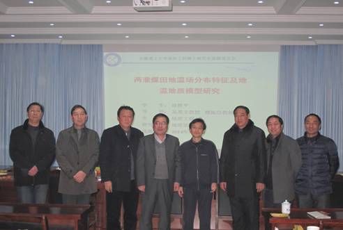 开题报告中,胡友彪教授介绍了徐胜平同学的学习状况,该同学为我校2010级博士研究生,研究方向为地质资源评价,在地质资源勘探、评价和利用等方面主持了多项纵横向项目,前期已完成博士研究生培养过程中的课程学习及开题准备,符合我校博士研究生开题要求。随后,徐胜平同学以“两淮煤田地温场分布特征及地温地质模型研究”为题,从选题意义、研究背景、国内外研究现状及存在问题、研究内容、研究方法、技术路线、预期成果及创新点、已开展的工作等方面进行了汇报,与会专家针对选题题目、研究内容、创新点等方面提出了修改和完善意见。专家们普遍认为,地温资源利用是将来国家能源开发的一个重要方向,选题所开展的地热资源利用和矿山热害治理等内容具有探索性。报告会后,校企双方针对不同层次技术人才培养、科研课题合作、实验研究所共建等方面进行了探讨。