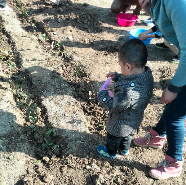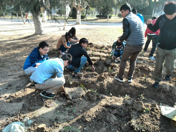 大家一起行动,挖坑、扶树、松土、埋土、浇水,大家有序分工,各司其职,小心翼翼地忙得不亦乐乎。在大家专心致志动手的时候,活动还吸引了很多路人的目光和关注,路过的一位可爱的小朋友还在母亲的指导下为刚刚栽好的树苗浇水,母亲告诉孩子,这么做以后小树就会茁壮成长,将来就会带来片片绿意和勃勃生机。看着如此温馨的场景,大家都感到很开心,很快乐。很多同学都是第一次植树,大家忙得满头大汗,但是看到那一排排整齐的树苗,想到自己亲手种的树以后能开出美丽的花朵,大家的脸上都露出了自豪的笑容。活动结束后,大家在一起合影把笑颜定格在了这美丽的春天。