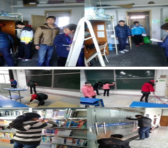 图书馆里,志愿者们在图书管理员的指导下,按要求把归还还未上架的图书整齐地放回原位,认真检查每个书架上有无顺序错乱的书;整理结束后,同学们又积极地打扫卫生,擦玻璃窗、书架、书柜等,经过耐心的整理和清扫之后图书馆焕然一新。