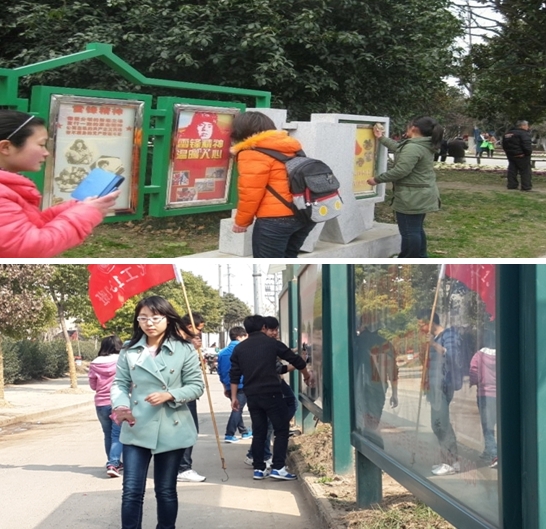 街道上,志愿者们来到园南路、国庆路、淮河大道,每到一个站台就忙活起来,认真地擦洗站台上的灰尘和各类小广告,很快几条道路上的站台焕然一新。