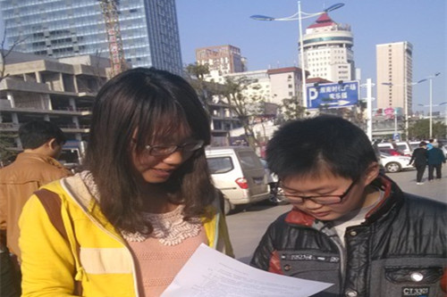 志愿者们向来往行人发放节水传单,和他们交流节水经验和技巧,并介绍我国目前严重的水危机以及刻不容缓的形势,让他们在了解更多节水知识的同时,将节约用水内化成生活原则。