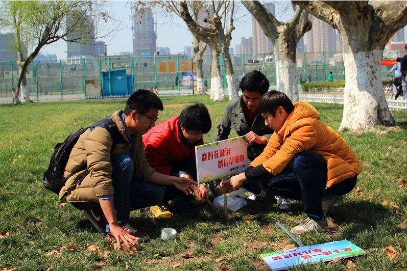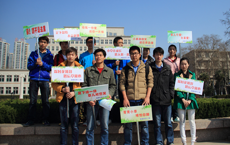 阳春三月、草长莺飞,冬天的寒意还未褪尽,春天带着绿色的气息向我们走来,春风吹生了枝头上的嫩芽,吹绿了地上的小草,也吹动了全院学生志愿服务的热情。活动前,志愿者们先在学院开展了环保宣传标语征集活动,最终从39副标语中精心选出如:“踩时花溅泪,踏后草揪心”“请您足下绕一绕,草儿对您笑一笑”等10条既可爱俏皮又充满爱心的对联。值得一提的是,这些制作标牌的费用都是志愿者卖饮料盒、旧书籍所得。活动中,志愿者分为四组,带着十余块标语牌分别前往两校区,在南门两侧、图书馆前广场、水房前绿地、爱情湖畔等十处草坪被踩踏、花枝有折痕的地方栽立环保标牌。活动结束后,志愿者中的学生党员还自愿对栽有标牌的草地片区进行长期维护,表示一定要保护好美丽校园。