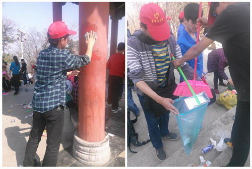 3月22日,志愿者们自带清理工具来到舜耕山。同学们三两一组,将沿途山路上的垃圾一一捡起放入准备好的垃圾袋中,人到地净。登上山顶后,同学们对山顶的亭子也进行了彻底的清理,扫地的扫地、擦桌凳的擦桌凳,并且对部分游客在亭子上留下的“污渍”进行了处理。活动过程中,志愿者们还不断向市民们宣传环保,动员市民们积极参加到环境保护中来,为环境的维护贡献自己的一份力量。
