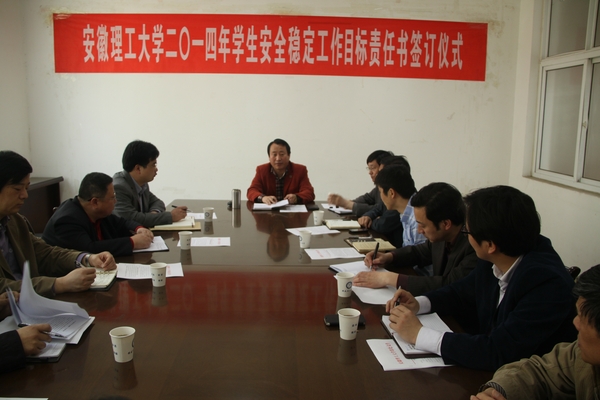为进一步加强学生安全工作,确保广大学生生命财产安全,维护学校正常教育教学秩序,4月3日上午,学校在大学生素质教育中心2楼会议室组织各学院签订了2014年学生安全稳定工作目标管理责任书。学生处处长田中良主持会议。