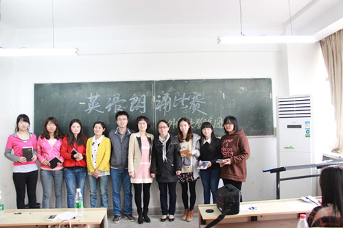 选手们各自朗诵精心准备的美文,刘晓菲朗诵的《Youth》清新流畅,陈芳模仿的林肯在葛底斯堡的演说慷慨激昂,胡鹏鹏模仿的VOA时政新闻抑扬顿挫,展现了良好的语音、语调、仪态和感染力,给在座师生留下了深刻的印象。经过精彩的角逐,刘晓菲获得一等奖,史皓冉和余曼获得二等奖,陆蓉、金丽和段艳莉获得三等奖。