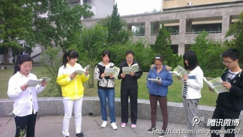 4月21日上午6:30,黎明才刚刚到来,天阴沉沉的,但是西区的英语角读书声朗朗,大一的学生早早地来到英语角朗诵马克思主义系列图书,读到精彩处,大家还聚在一起讨论分享。
