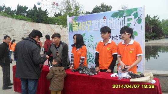 同时,志愿者们还开展了“地球日绿色行动”活动。志愿者们现场发放垃圾袋,以垃圾换礼品的形式,呼吁市民从点滴做起,加入保护自然生态的行列中来。不到半个小时的时间,就有百余名市民参与到“绿色行动”中来,不少小朋友在家长的陪同下参与活动中。其中,60岁的李阿姨受志愿者感染,穿上向大学生借来的科普志愿者T恤衫,与大学生一道向过往市民宣传环保知识,倡导环保理念。