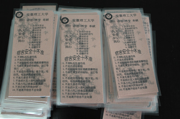 为使安全知识入脑、入心,外国语学院创新安全宣传教育模式,收集安全知识要点印制在书签上,提醒学生时刻学习安全知识,提高安全意识,将安全教育和管理落到了实处。书签卡上设有九大安全牢记我心、宿舍安全十不准、宿舍防盗小贴士、预防春夏季传染性疾病温馨提示、低碳生活小贴士等五大版块,涉及到防溺水安全、传染病防控、宿舍安全、财产安全、信息安全、心理安全、离校安全、活动安全、交通安全等九大方面内容,并重点强调了宿舍安全需要注意的十大事项。小小书签卡,是安全知识宣传内容的凝练,也方便学生随身携带,时刻提醒学生重视安全,将安全两字牢记于心,强化了学生的安全认识,增强防范意识。