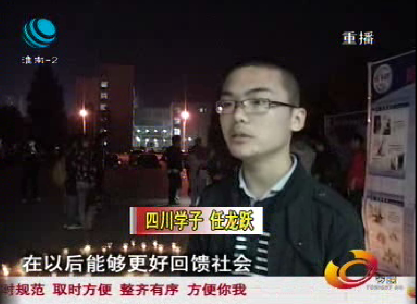 为纪念汶川大地震六周年,5月11日晚,土木建筑学院学子在北校区实验楼广场开展了向汶川地震遇难同胞默哀祈福活动。活动受到了淮南电视台的关注,并在5月12日淮南二套《今晚800》节目中进行了报道。