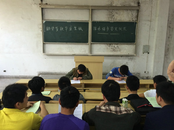 144名贷款毕业生签订了《安徽理工大学2014届助学贷款毕业生诚信承诺书》,表示愿意信守承诺,履行银行借款合同和还款协议上的各项条款及有关规定,按时足额还款,绝不违约,在今后的工作和生活中做到遵纪守法、诚信做人、爱岗敬业。