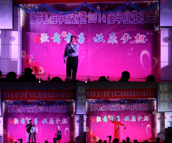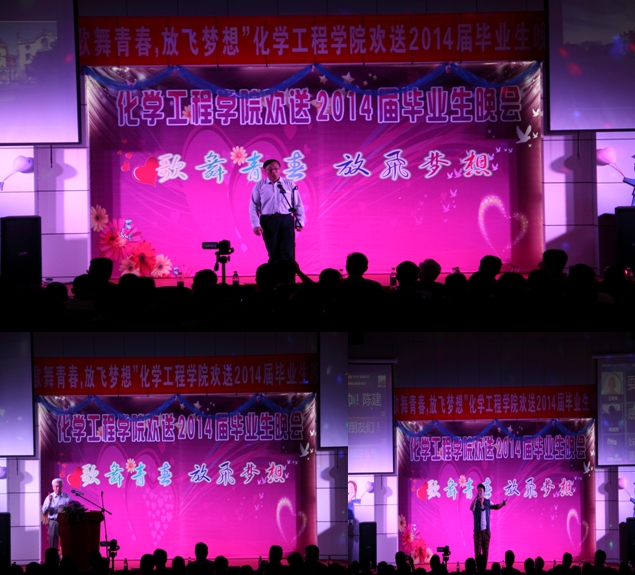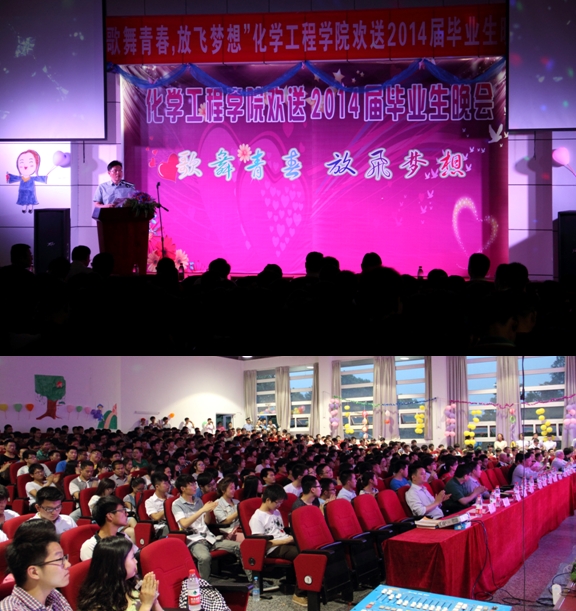 凤凰花开季,同窗道别时,在仲夏五月,化学工程学院“歌舞青春,放飞梦想”欢送2014届毕业生晚会在北区图书馆报告厅隆重举行。校学生处副处长黄晟、校团委副书记赵宁、学院关工委副主任汪大立、学院党政领导及师生500余人共同观看了精彩纷呈的文艺晚会。