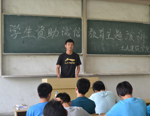 5月10日,学院毕业班辅导员分别召开主题班会,召集毕业班助学贷款的同学当面签订《安徽理工大学2014届助学贷款毕业生诚信承诺书》,发放《生源地助学贷款还款指南》,提醒毕业生认真阅读还款指南,按要求履行还款义务,并进行了诚信宣誓活动。