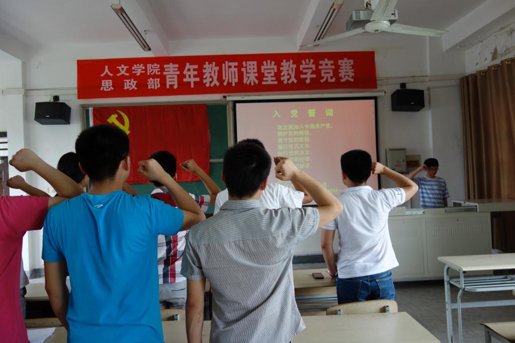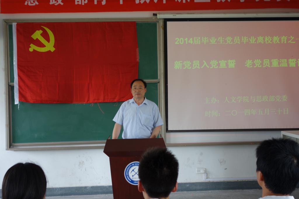 5月30日下午3时,人文学院2014届毕业生文明离校教育系列活动之 “党员重温誓词、新党员入党宣誓”活动在学院楼401教室隆重举行。人文学院与思政部党委副书记、人文学院副院长吴云平主持宣誓活动,学生党支部书记兼学院辅导员张娜老师、学院全体毕业生党员和在校学生党员参加了重温誓词和入党宣誓活动。