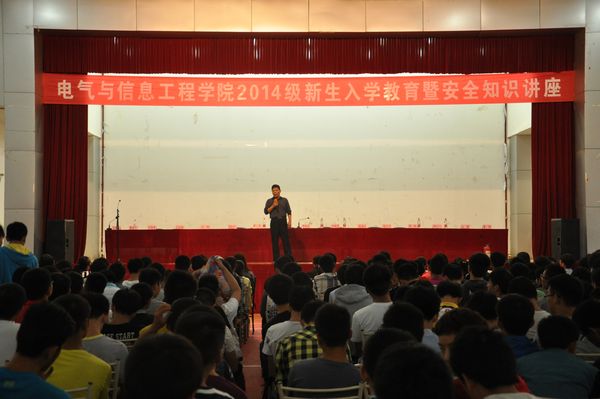 9月13日下午,电气与信息工程学院邀请校保卫处消防科科长卢传江老师在北区体育馆为学院2014级新生开展安全知识专题讲座。讲座由学院党委副书记董淑平主持,学院2014级全体新生及新生辅导员参加了讲座。