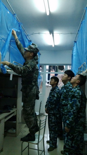 9月17日下午3:00,六营材料科学与工程学院的军训教官们深入新生宿舍开展军训整理内务活动。