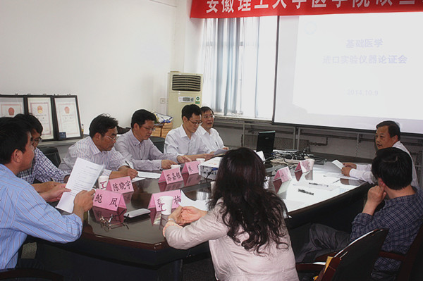 10月9日下午,医学院在院病原生物学与分子免疫学教研室学术报告厅联合召开2014年提升计划中医学类有关进口设备采购的专家论证会。安徽中医药大学附属医院鲍凤教授、安徽医科大学陈晓宇教授、淮南市第一人民医院张梅教授、淮南市东方医疗集团胡万发副教授应邀参加了论证会。