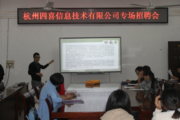 10月21日晚,经济与管理学院在经管楼3楼会议室举办了专场招聘会,杭州四喜信息技术有限公司应邀前来招聘毕业生。学院2015届100余名学生参加了本次招聘会,毕业班辅导员老师李双双参与并主持了本次招聘会。