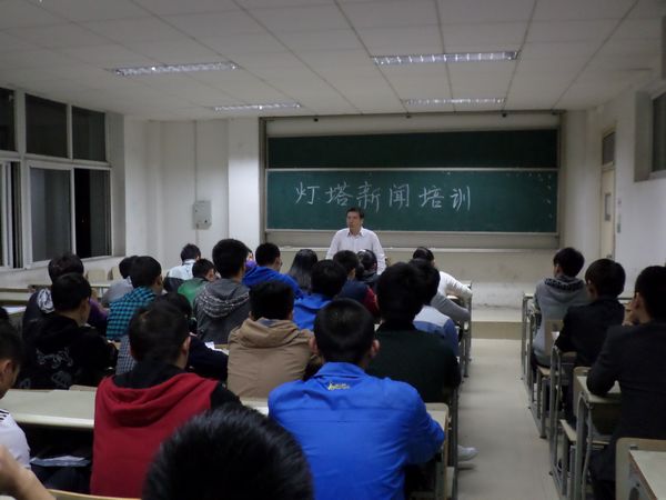 10月23日晚,电气与信息工程学院党委副书记董淑平为学院“灯塔”通讯社40多名成员举办新闻写作讲座。
