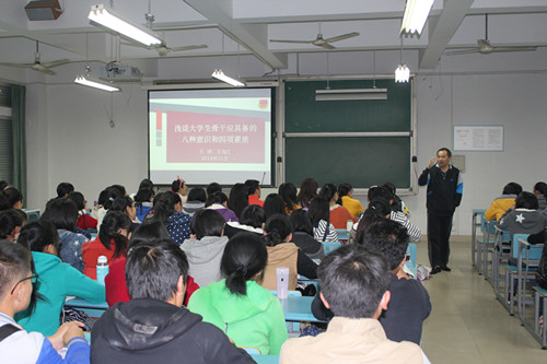 讲座中,王先江开门见山强调了“情商”对于大学生出身社会的重要性。他指出,大学是大学生步入社会的起点,大学生在大学期间不仅要学习专业知识,更要在4年大学生涯中努力提高自己的“情商”。王先江表示,“八种意识”和“四项素质”是当代大学生骨干所必须具备的,他结合自身工作经历和生活经验,深入浅出地向学员们介绍了政治意识、责任意识等八种意识及业务素质、道德素质等四项素质。