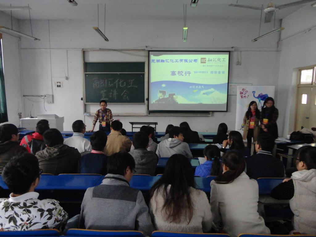 11月8日,芜湖融汇化工有限公司、浙江联化科技股份有限公司在结束了上午学校举行的秋季洽谈会后,下午分别在新附2102、新教1206教室就毕业生就业工作继续与化学工程学院进行深入交流,同时举办就业指导讲座,学院能化、化工及应化等专业同学参加讲座。